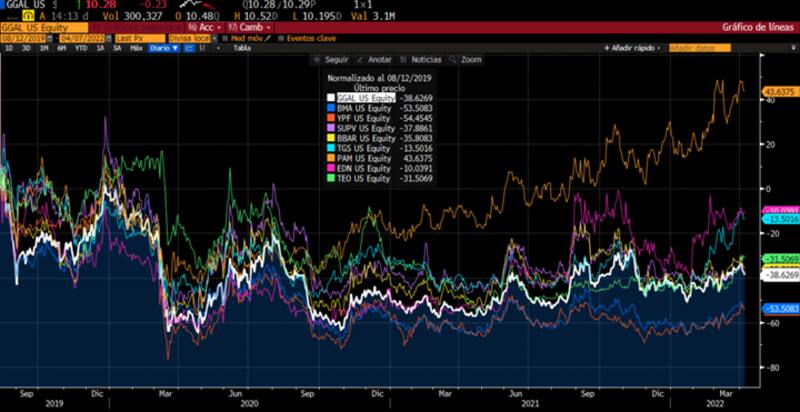 Las acciones caen entre 54% y 10% respecto de los valores inmediatos alcanzados tras el selloff de agosto de 2019. Se destaca Pampa que se ubica un 43% por encima de los valores alcanzados tras la caída inmediata al resultado electoral de agosto de 2019 y valores similares a la pre-pandemia.