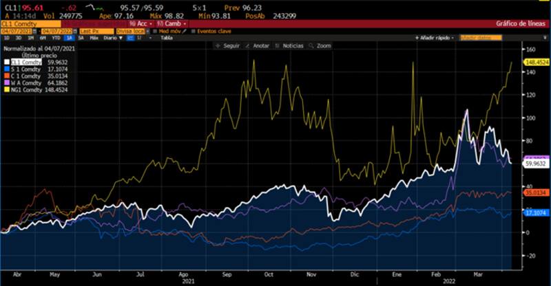 Las acciones argentinas se ven influenciadas tanto por cuestiones globales como locales. En este escenario, las materias primas muestran fuertes avances en el último año. El petróleo gana 59% y el gas natural sube 148%.