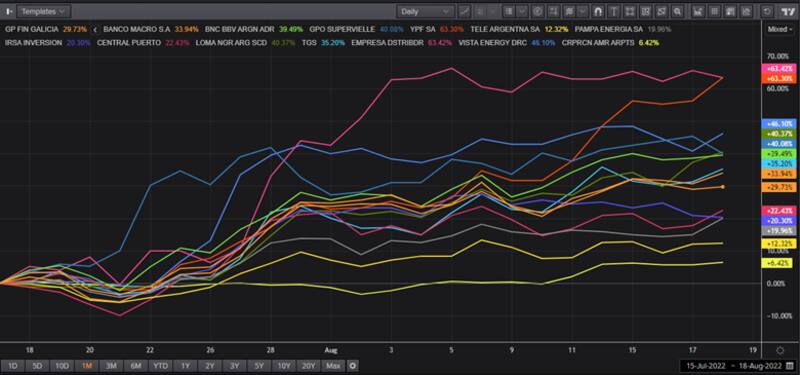 Las acciones argentinas muestran unasuba del 30% en dólares en las últimas semanas. Parte del rally se debieron a cuestiones locales y parte a cuestiones internacionales.