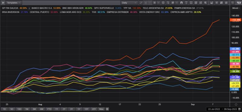 El rally en las acciones argentinas está siendo impresionante. Dentro de los ADRs, hay casos que avanzan más del 130% desde el piso de fines de julio.