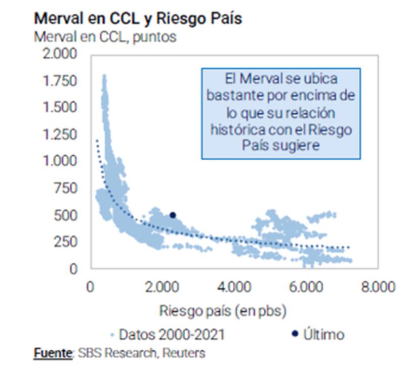 Es decir, según advierten los analistas, el S&P Merval se ubica bastante por encima de lo que su relación histórica con el riesgo país sugiere.