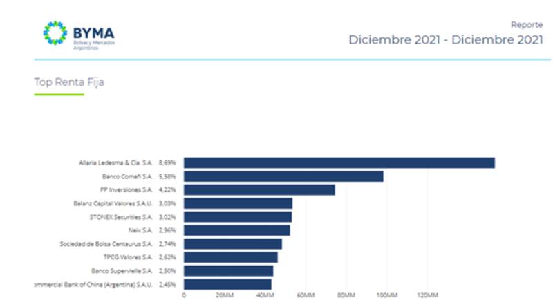 Según el informe de ranking de volumen operado por Alycs que elabora ByMA, los brokers que más volumen operaron en diciembre fueron Allaria Ledesma, con el 8,69%, Banco Comafi, con el 5,58% y Portfolio Personal Inversiones (PPI), con 4,22%.