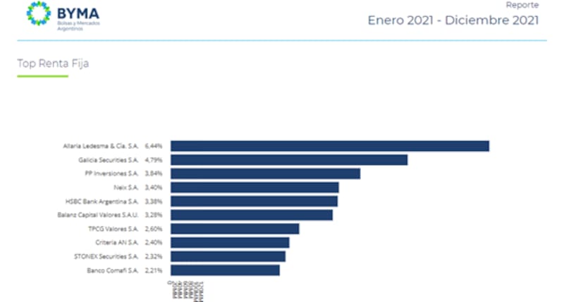 El listado de las 10 compañías que mayor volumen concentraron a lo largo del 2021 se completa con Neix, HSBC Bank Argentina, Balanz Capital, TPCG valores, Criteria, Stonex Securities y Banco Comafi.