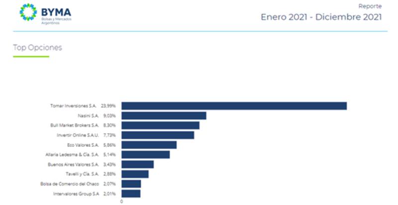 A Tomar inversiones le sigue Nasini que operó el 9,03% del total, BullMarket Brokers (8,3%), InvertirOnline (7,73%), Eco Valores (5,86%) y Allaria Ledesma con el 5,1%, completando las 5 Alycs que mas volumen operaron en 2021 en opciones.