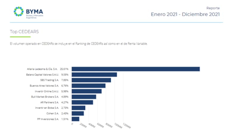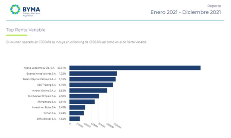 En cuanto al balance anual, según el informe de ByMA, Allaria Ledesma fue la sociedad de bolsa que mayor volumen concentró con el 6,44%, seguida por Galicia Securities y PP Inversiones con el 4,79% y 3,84% respectivamente.