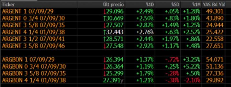 En ese sentido, la deuda opera al alza. Todos los tramos de la curva argentina registran ganancias mayores al 2%.