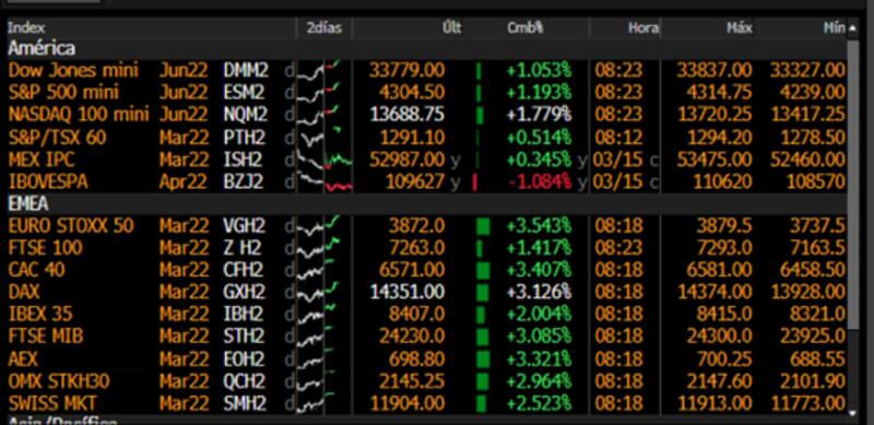 Los futuros del S&P 500 suben 1,3 %, mientras que el Dow Jones gana 1,05%. Por su parte, los contratos para el Nasdaq-100 enfocado en el sector de tecnología rebotan un 1,8%.