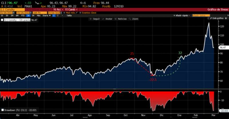 Los mercados subieron ayer gracias a que el fuerte selloff del petróleo permitió que se reduzcan en el margen los temores de una mayor inflación. En las últimas jornadas, el petróleo perdió gran parte de lo que subió desde el inicio de la guerra entre Rusia y ucrania y desde su techo reciente, cae 22%.