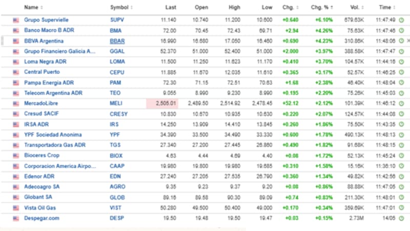 Otros papeles como Loma Negra, Central Puerto, Pampa, Telecom, MercadoLibre, Vresud, YPF, IRSA, suben entre 1,7% y 3,9%