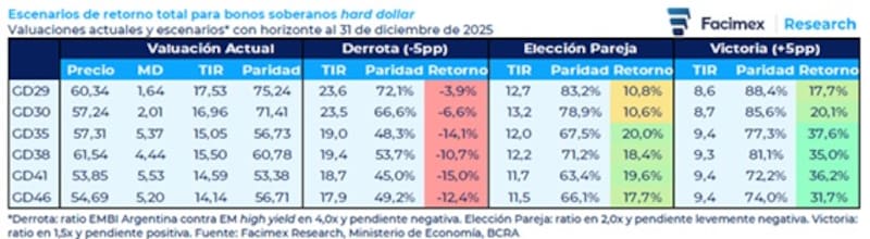 Ante un escenario de derrota, los bonos podrían perder entre 4% y 15%, mientras que, en un contexto de elección pareja, los bonos podrán ganar entre 10% y 20%. A su vez, ante una victoria, según Facimex Valores, la deuda podría subir entre 17% 37%.