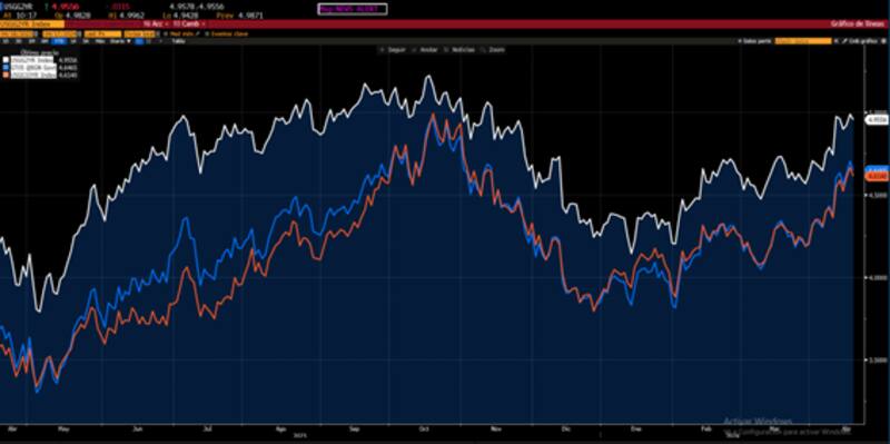 Las tasas de los bonos del Tesoro de EE.UU. a 2 años subieron a 4,95%, si mayor valor desde noviembre pasado. Lo mismo ocurrió con los bonos a 5 años, en los que sus tasas subieron a 4,65%, su mayor valor desde noviembre.