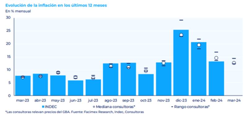 Las mediciones privadas estuvieron en un rango del 12,2% a 14,3% mensual para marzo, con una mediana del 12,6% mensual.