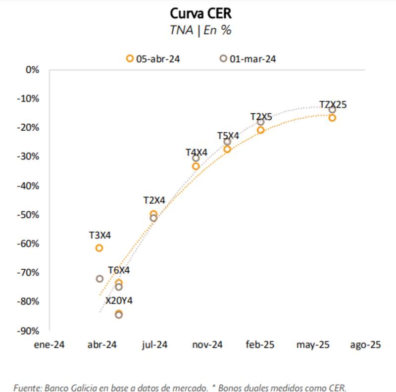"Esto implica ir a instrumentos con vencimiento más allá de octubre 2024 (T5X4 / T2X5). Inclusive en el tramo más largo puede haber oportunidades interesantes, aunque la liquidez pueda ser algo más acotada. El tramo más corto de la curva CER solamente puede dar más valor si la inflación de marzo termina siendo más alta de lo que espera el mercado, caso contrario opera por "liquidez", es decir alineado con las tasas más bajas que se obtienen en cuentas remuneradas o money market", dijo.