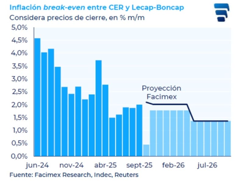 Desde Sailing Inversiones agregaron que y los break-even de la curva CER se encuentran hoy convergiendo hacia las estimaciones del REM, lo que sugiere que el mercado ya descuenta un sendero de desinflación gradual de cara a los próximos meses.