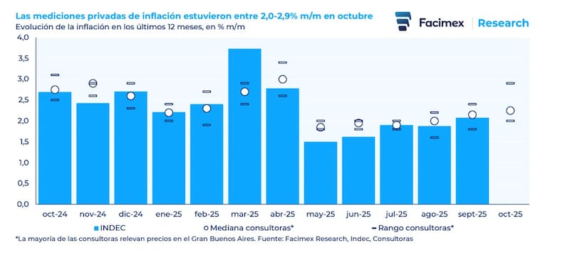 Adrián Yarde Buller, economista jefe de Facimex Valores, detalló que las mediciones privadas brindaron señales mixtas con respecto al 2,1% mensual que reportó el Indec para septiembre; aunque la mayoría de ellas fueron iguales o superiores a sus propias mediciones para septiembre.