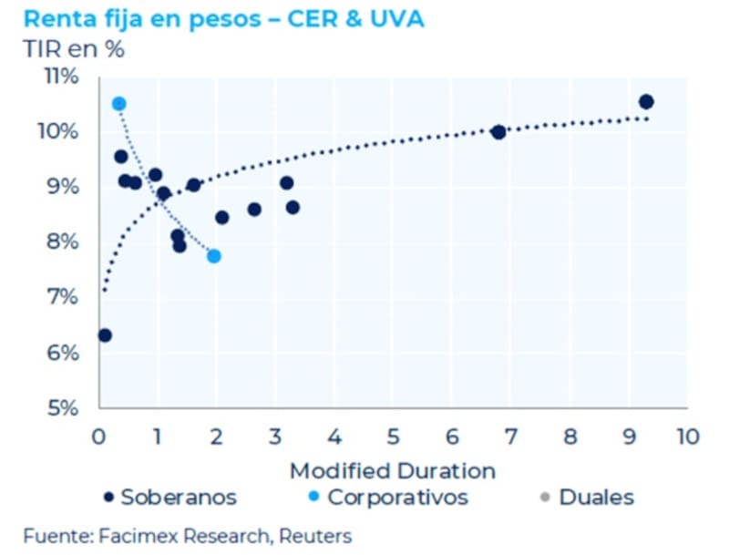 “Vemos la curva CER rindiendo entre 8% los más largos y 10% los bonos más cortos; y estimamos que le mercado vaya comprimiendo la curva a medida que avance la baja de inflación”, comentó.