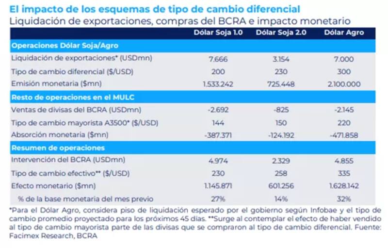 Sobre este monto, el economista de Faxcimex Valores determinó que la misma es una inyección monetaria significativa que equivale al 32% de la base monetaria del mes pasado (41% en el escenario de USD9MM), por encima del 27% alcanzado bajo el Dólar Soja 1.0 y el 14% del Dólar Soja 2.0.