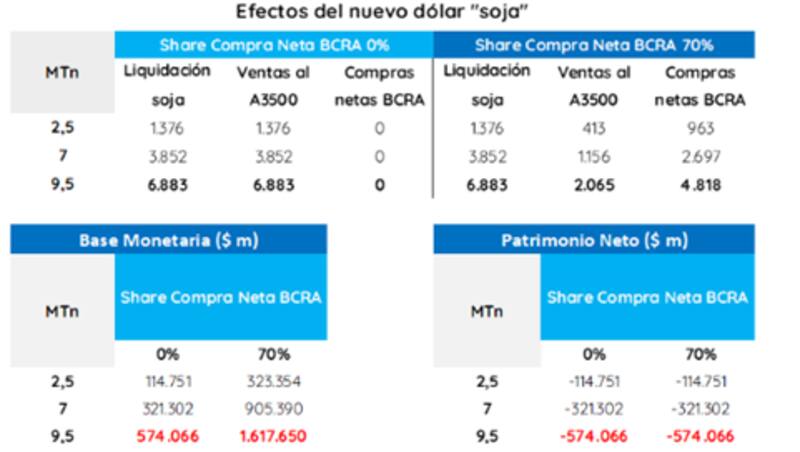 "En el actual esquema cambiario el BCRA debe inyectar más pesos que los que logra retirar cuando vende divisas, debido al diferencial entre ambas paridades cambiarias. Probablemente esto tenga un impacto sobre los tipos de cambio "financieros" y la inflación, pudiendo limitarse el impacto sobre los primeros si el gobierno decide restringir el acceso a los mismos si se hace uso del "dólar soja", dijo.