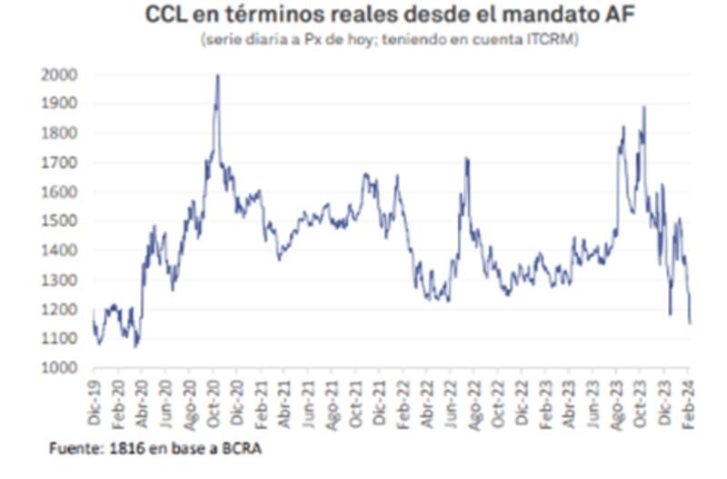 El CCL medido en términos reales se ubica en $1200, su menor nivel desde abril de 2020, lejos de los $1500 con los que inició Milei su mandato y mucho más alejado de los $1900 de fines del 2023.
