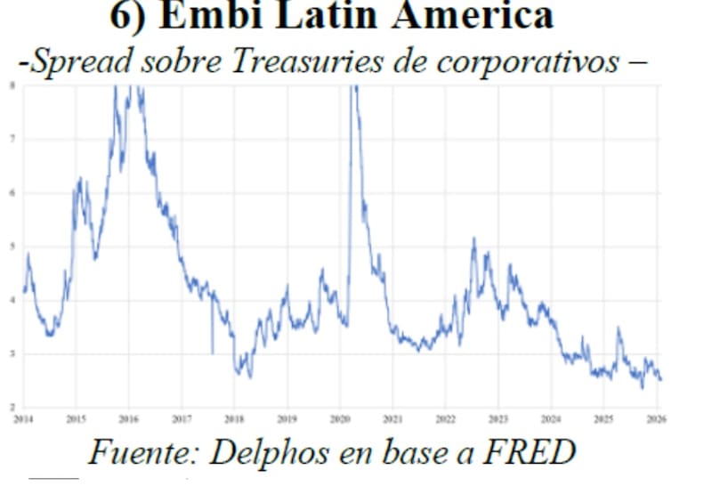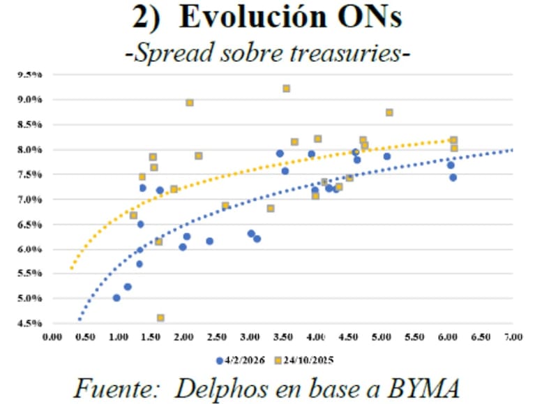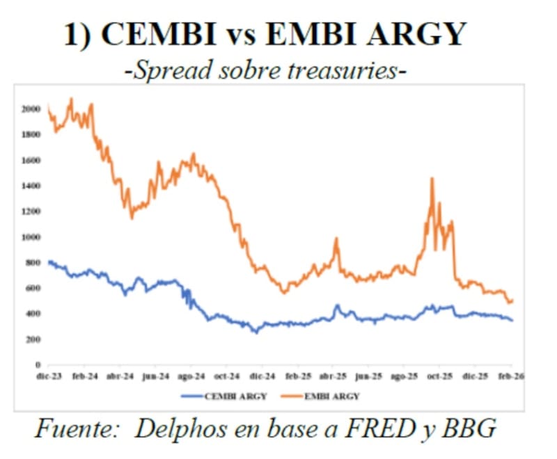 Los analistas de Delphos Invetsments favorecen una estrategia de rotar desde soberanos cortos hacia créditos corporativos argentinos (ONs) del tramo largo, aprovechando que el riesgo país corporativo (CEMBI) quedó rezagado frente a la fuerte compresión del EMBI desde elecciones.