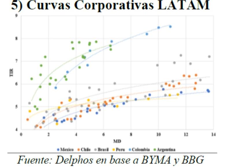 Además, agregó que, tras la compresión notable en las curvas corporativas regionales, se observa un descalce entre los ratios de deuda de los créditos corporativos argentinos y el diferencial de tasas frente a las curvas corporativas de México, Brasil, Chile y Perú.