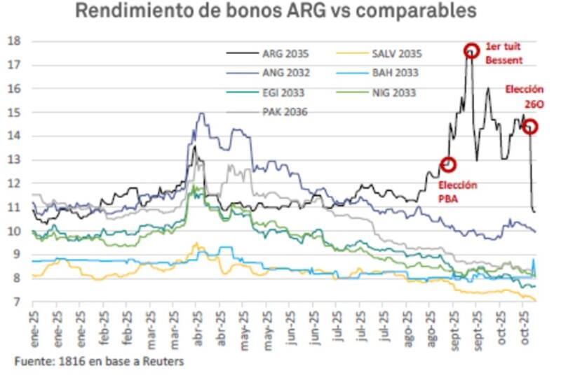 "Con semejante triunfo de Milei y con el apoyo de EE. UU., nuestro escenario base es que Argentina volverá a acceder al mercado internacional en los próximos meses, para lo que sería necesario que el riesgo país siga comprimiendo y rompa los mínimos de enero de 570 pbs. No es un pronóstico particularmente aventurado ya que en abril el Global 2035 (a 10 años) rendía como sus pares de Pakistán, Nigeria o Egipto, q ue hoy en día rinden menos de 9% YTM", detallaron.