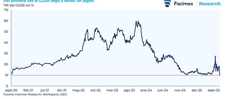Actualmente el GD29 opera con un rendimiento de un dígito, reflejo de que Argentina se acerca cada vez más a recuperar el acceso al mercado.