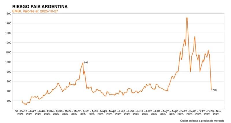 "La semana pasada el riesgo país cayó 424 pbs, desde 1.081 pbs el viernes previo a la elección a 657 pbs el viernes pasado; llevando el ratio entre el riesgo país de Argentina y el spread de emergentes high yield de 2,9 veces a 1,9 veces. Esperamos que el ratio caiga a 1,5 veces, es decir, consistente con riesgo país en 520 a 530 pbs, permitiendo volver al mercado", afirmó Yarde Buller.