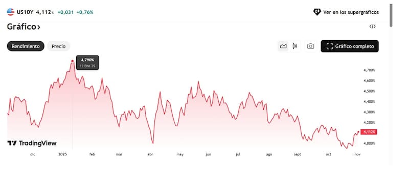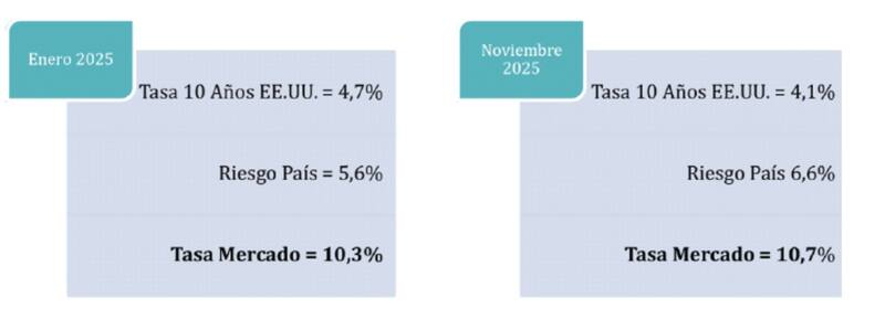 "Si bien el riesgo país todavía no comprimió a los niveles de enero 2025, las tasas libres de riesgo (bonos del Tesoro de Estados Unidos a 10 años como referencia) están en niveles 0,6 puntos porcentuales por debajo de lo que estaban en enero", sostuvo.