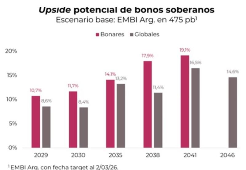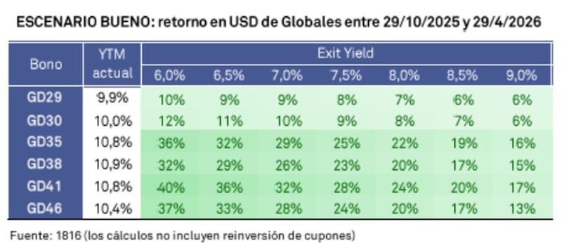 "En un escenario de retorno total a tres meses en el que la curva soberana se normalice a niveles consistentes con una calificación crediticia B- (con rendimientos cercanos al 8%), consideramos que los bonos GD35 y GD41 ofrecen el mayor potencial de apreciación, estimado en torno al 20%", dijeron.