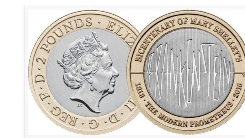 Otra original moneda de dos libras, que luce una tenebrosa caligrafía, marca la publicación hace doscientos años de la novela "Frankenstein", cuando la autora Mary Shelly (1797-1851) tenía sólo 20 años.