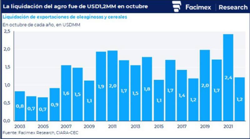 De hecho, la liquidación de un mes de octubre pasado fue más baja desde 2015, cuando en aquel año se habían liquidado u$s 1100 millones y se iguala a la liquidación del octubre de 2018.