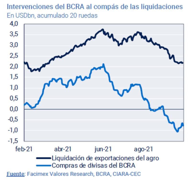 Los esfuerzos del BCRA para mantener a raya el tipo de cambio se hicieron cada vez más persistentes desde junio a la fecha, en donde la autoridad monetaria cortó su racha alcista de intervenciones compradoras junto con una pausa en las liquidaciones del agro.