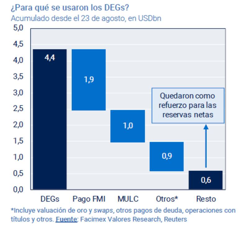 El ingreso de los DEGs fue un respiro, pero, así como entró, se usó. Según cálculos de Adrían Yarde Buller, economista jefe y estratega de Facimex Valores, de los u$s 4400 millones que ingresaron por los derechos especiales de giro, unos u$s 1.900 millones se utilizaron para pagar al FMI, u$s 1000 millones se vendieron en el MULC, u$s 900 millones para otras operaciones con títulos y quedaron solamente u$s 600 millones como refuerzo de las reservas netas.