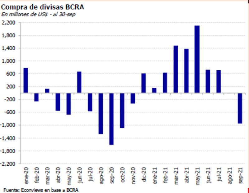 "En septiembre la intervención del BCRA fue negativa por u$s 950 millones, cortando una racha de 9 meses consecutivos de compras netas. Los últimos tres días de la semana pasada, el BCRA vendió u$s 313 millones para abastecer un mercado de cambios que se anticipa cada vez más adverso", dijeron.