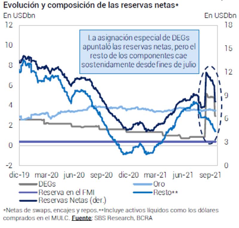 "La asignación especial de DEGs apuntaló las reservas netas, pero el resto de los componentes cae sostenidamente desde julio. Todo sugiere que las ventas en el MULC continuarían por unas semanas más. Por su parte, suele observarse una aceleración en la tasa de devaluación post PASO, aunque creemos que dado el uso del ancla cambiaria por parte del Gobierno se buscará no acelerarla demasiado. No obstante, consideramos que la mayor expansión monetaria hacia el resto del año pondrá presión sobre el plano cambiario, por lo que la administración de las cuentas externas requerirá ingenio", advirtió.