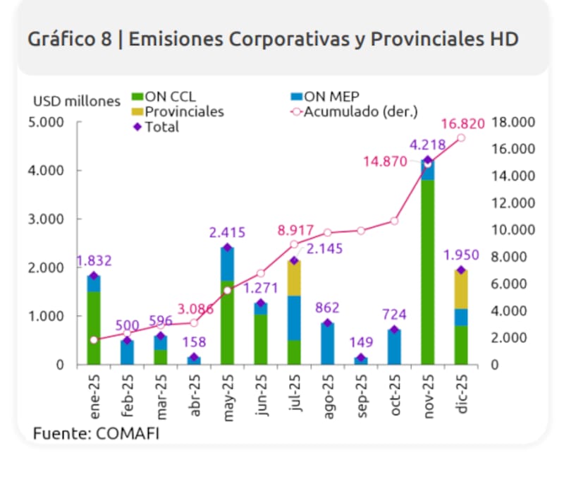 “Tras la sorpresa favorable de las elecciones de medio término, las emisiones corporativas y subsoberanas se aceleraron y ya suman casi u$s 6200 millones, un volumen similar al de todo el primer semestre”.