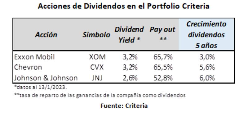 "En dicho contexto y de cara al 2023, el Portafolio Recomendado de Cedears Criteria mantiene en cartera activos que ofrecen un margen de seguridad a través del pago de dividendos. Estos tres activos obtuvieron una tasa de crecimiento de sus dividendos en los últimos 5 años superior a la media", dijo.