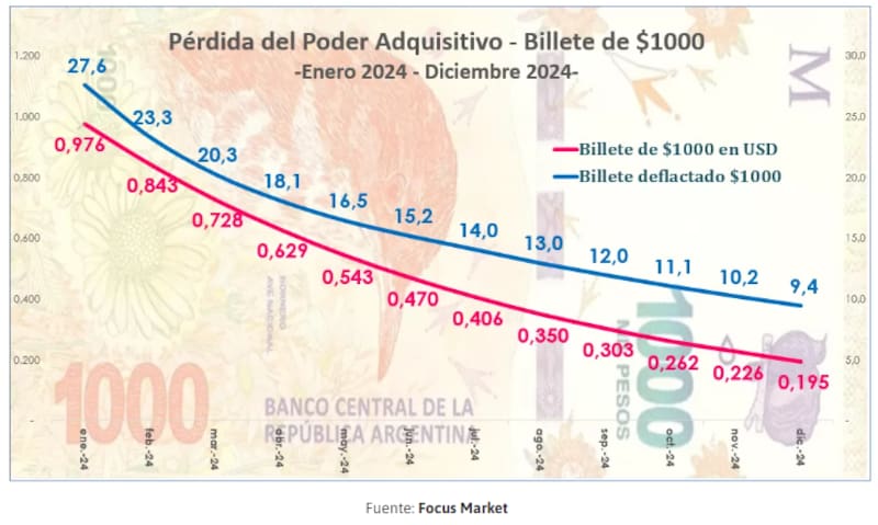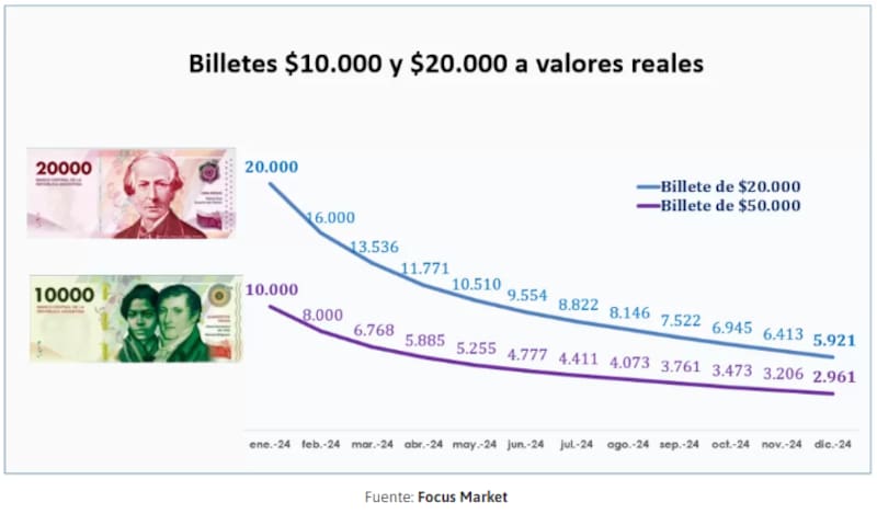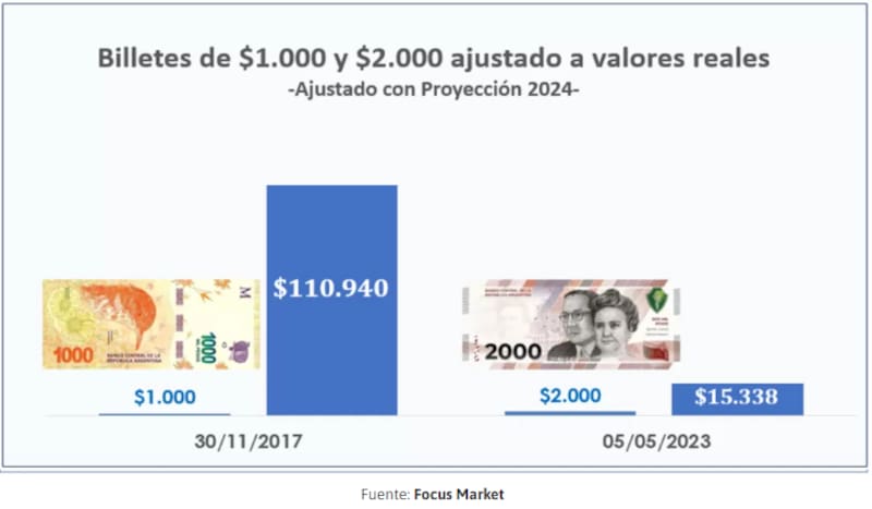 "Si asumimos un 2024 con inflación proyectada por sobre el 213% podemos considerar que estos billetes al final del período valgan aproximadamente $ 2961 y $ 5979 respectivamente, lo que significa que la pérdida de poder adquisitivo de nuestra moneda seguirá su curso", detallaron desde la consultora.