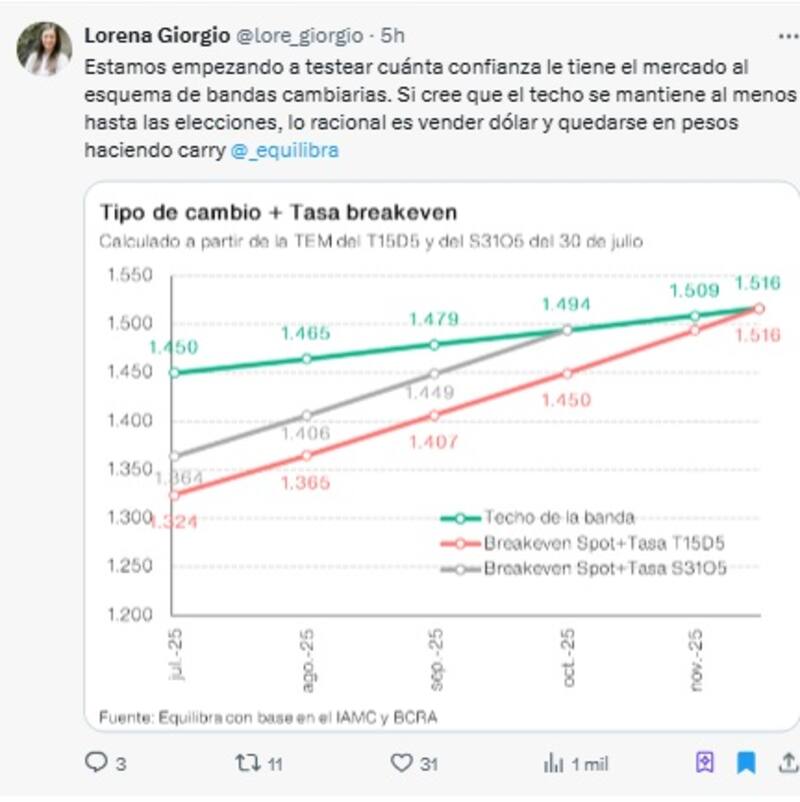 Lorena Giorgio, economista jefe de la consultora Equilibra, fijó su punto de vista, en medio del salto del tipo de cambio. "Estamos empezando a testear cuánta confianza le tiene el mercado al esquema de bandas cambiarias. Si cree que el techo se mantiene al menos hasta las elecciones, lo racional es vender dólar y quedarse en pesos haciendo carry".