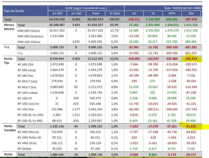 En paralelo, los fondos T+1, que suelen funcionar como un escalón intermedio entre money market y renta fija, también mostraron fuertes rescates por más de $ 850.000 millones.