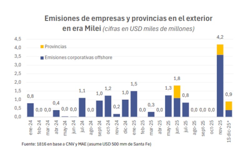 Ese quiebre se profundizó en 2025. Durante el primer trimestre, las empresas sostuvieron un ritmo estable de entre u$s 1000 y u$s 1500 millones por mes, mientras que las provincias retomaron la práctica de emitir deuda externa con mayor regularidad. El salto de noviembre de 2025, sin embargo, marca un antes y un después.