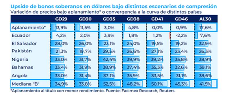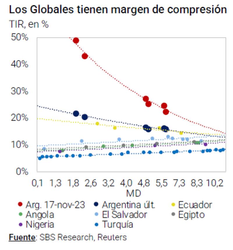 "Seguimos viendo valor a mediano plazo en Globales. Una mirada a curvas de emergentes sigue mostrando espacio para comprimir. Para perfiles que apuesten a una compresión hacia niveles de Ecuador vemos valor en el tramo corto de Globales mientras que aquellos más optimistas (que deberá venir necesariamente acompañada de un delivery más firme en materia de normalización económica), nos parecen atractivos GD35, GD38 y GD41", dijo Franco.