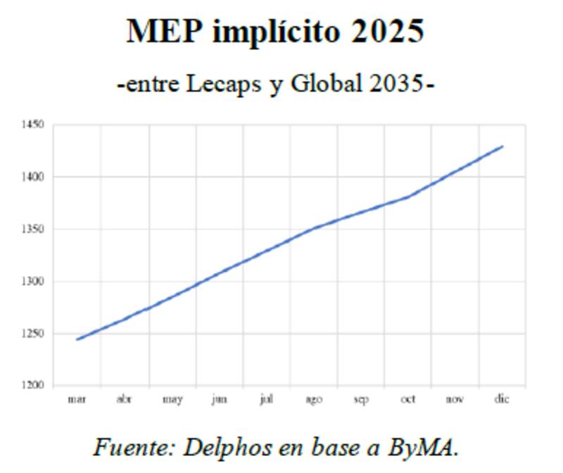 Según estimaciones de Delphos Investments, al construir el MEP de indiferencia entre la curva de Lecap y el Global 2035, obtenemos un dólar estimado en $ 1430 para fin de año y en torno a $ 1380 previo a las elecciones de medio término.