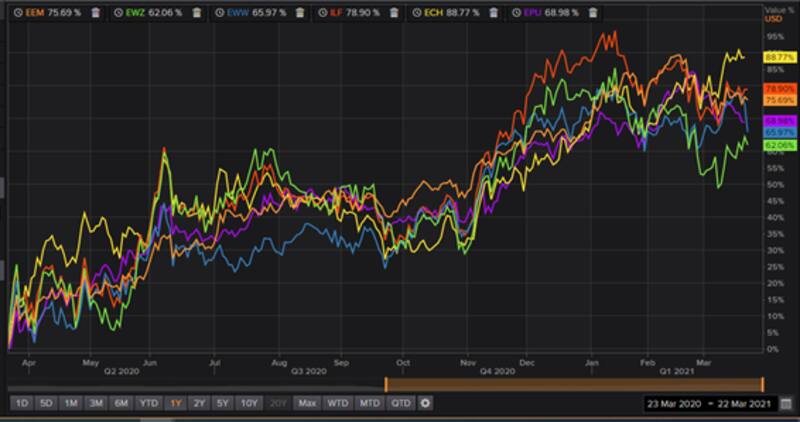 Sin embargo, las acciones de Brasil, México y Perú tuvieron una performance peor respecto del índice, aunque igualmente positivas. El ETF de Perú gana 69% en el último año, seguido por México y luego Brasil que avanzaron 67% y 62% respectivamente.