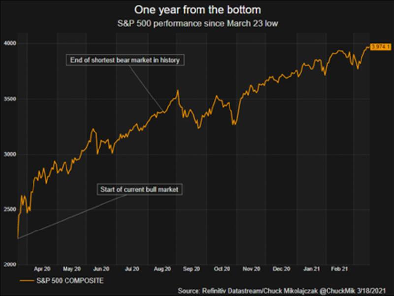 Se cumple un año desde que el mercado estadounidense alcanzó su peor momento de la crisis del coronavirus. Pero también se cumplen 12 meses desde que Wall Street hizo piso e inicio un nuevo ciclo alcista, logrando una velocidad de recuperación nunca antes vista.