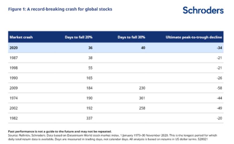 Entre el techo de febrero y el piso del 23 de marzo de 2020, el S&P 500 retrocedió 34%, en la que fue la más rápida en la historia. Según los analistas de Schroders, en 2020 el mercado cayó más de un 20% en menos de 36 días y más del 30% en 40 días, superando en la velocidad de la caída a retrocesos históricos como el crash de 1987, de 2009 o incluso del 2002.