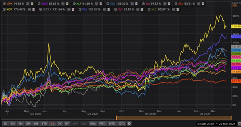 Yendo a los distintos sectores, el de extracción de petróleo y el de hotelería y ocio son los que lideran las ganancias, subiendo 176% y 152% respectivamente desde entonces. Más atrás le siguen el sector aerocomercial, energético y de materiales que anotan subas respectivas de 121%, 108% y 102%, mientras que sectores como el financiero y el industrial avanzaron, desde el 23 de marzo de 2020 hasta la fecha, 91% y 97% respectivamente.