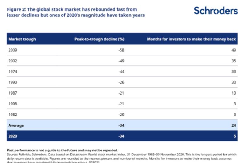 Duncan Lamont, CFA y head of research and analytics de Schroders, remarcó en una nota enviada a sus clientes a finales de 2020 que las pérdidas en la caída récord en las acciones de Wall Street se recuperaron por completo el 23 de agosto de 2020, solo cinco meses después de que el mercado tocó fondo y mientras la economía mundial todavía estaba sumida en la crisis.
