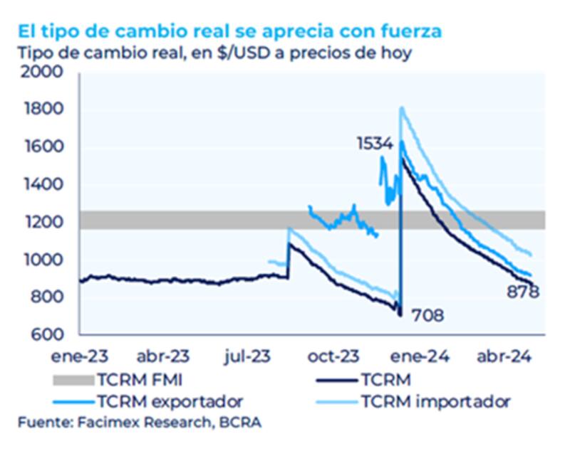 "El TCR siguió apreciándose en abril y el propio ministro Luis Caputo apuntó recientemente a que vamos a convivir con un TCR más apreciado. Creemos que este será uno de los puntos clave a seguir durante las próximas semanas, con pagos de importaciones bajo el esquema vigente desde diciembre que empiezan a completarse, atenuados en parte por menores importaciones devengadas por la recesión", anticipó.
